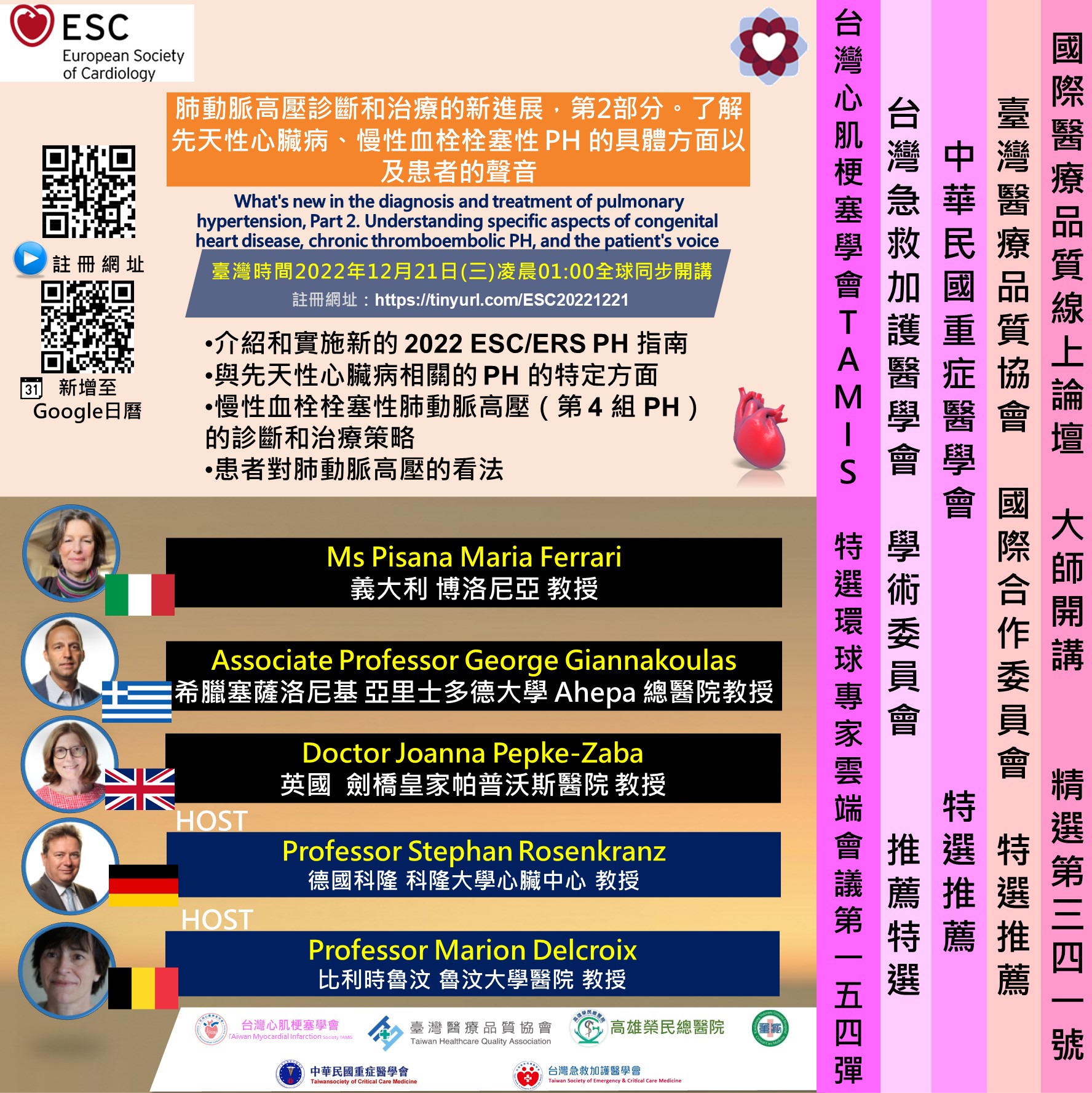 讓歐洲心臟醫學會專家告訴您 肺動脈高壓診斷和治療的新進展,第 2部分。了解先天性心臟病、慢性血栓栓塞性 PH 的具體方面以及患者的聲音 最新資訊!