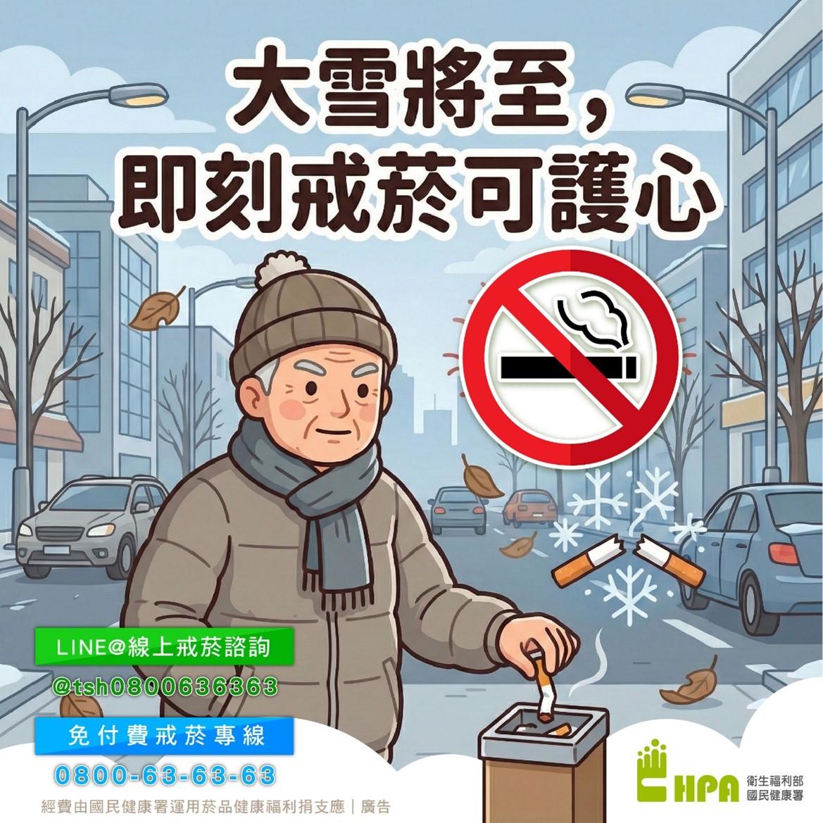 12月7日為今年二十四節氣的「大雪」,象徵冬季正式到來。氣溫驟降時容易導致血管急速收縮,使血壓上升;若再加上吸菸造成的血管損傷與血液濃稠度增加,相互影響更可能誘發心肌梗塞或中風等心血管疾病風險。國民健康署呼籲,有吸菸習慣者應立即戒菸,守護心臟健康。